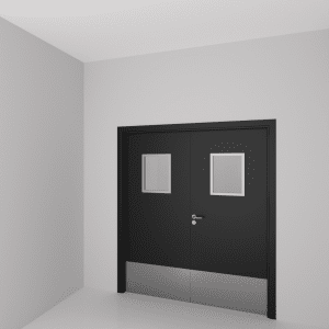 Porta de uso interior para entrada de unidade autônoma e demais ambientes internos com necessidade de alta proteção a impactos na base inferior (Inox 400mm), além de visibilidade ou iluminação através da porta, em ocupação Coletiva ou Privada.