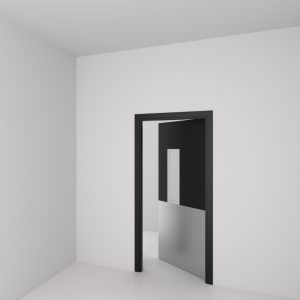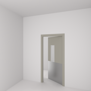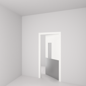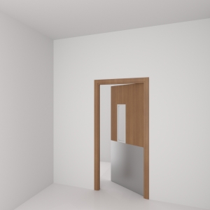 Porta de uso interior com abertura tipo vaivém, indicada para ambientes internos com necessidade de alta proteção a impactos na base inferior (Inox 900mm) e visibilidade através da porta, em ocupação Pública, Coletiva ou Privada.