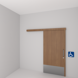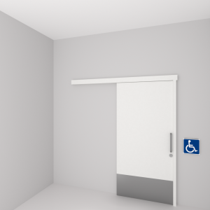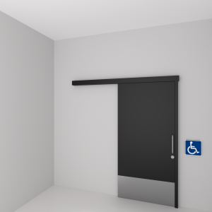 Porta de uso interior com necessidade de alta proteção a impactos na base inferior (Inox 400mm), indicada para Pessoas Com Deficiência – PCD, em ocupação Pública, Coletiva ou Privada.