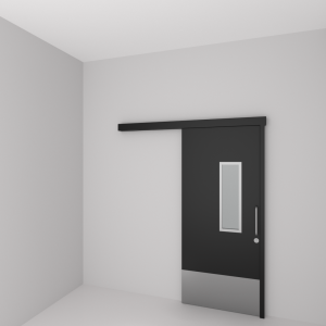 Porta de uso interior com necessidade de alta proteção a impactos na base inferior (Inox 400mm), além de visibilidade ou iluminação através da porta, em ocupação Pública, Coletiva ou Privada.