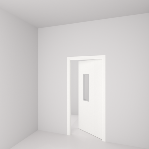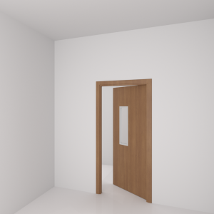 Porta de uso interior com abertura tipo vaivém, indicada para ambientes internos com necessidade de visibilidade através da porta, em ocupação Coletiva ou Privada.