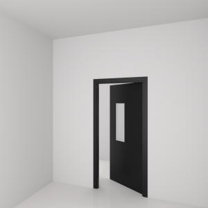 Porta de uso interior com abertura tipo vaivém, indicada para ambientes internos com necessidade de visibilidade através da porta, em ocupação Pública, Coletiva ou Privada.