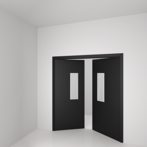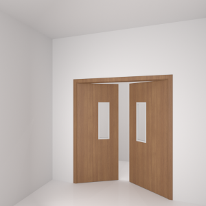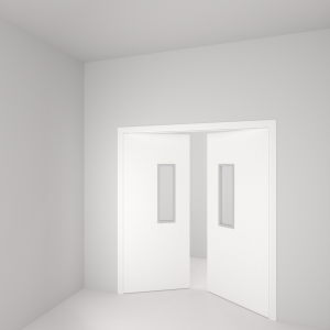 Porta de uso interior com abertura tipo vaivém, indicada para ambientes internos com necessidade de visibilidade através da porta, em ocupação Pública, Coletiva ou Privada.