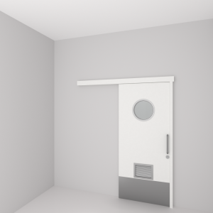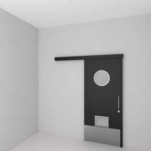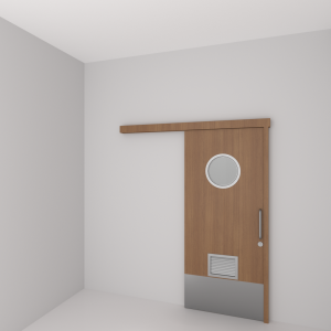 Porta de uso interior com necessidade de alta proteção a impactos na base inferior (Inox 400mm), além de visibilidade ou iluminação e também de ventilação através da porta, em ocupação Pública, Coletiva ou Privada.