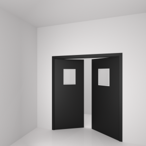 Porta de uso interior com abertura tipo vaivém, indicada para ambientes internos com necessidade de visibilidade através da porta, em ocupação Pública, Coletiva ou Privada.