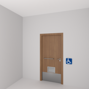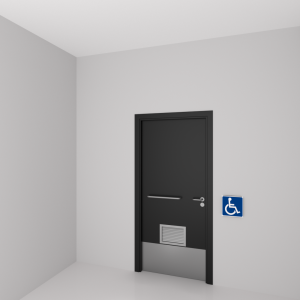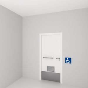 Porta de uso interior para entrada de unidade autônoma e demais ambientes internos para Pessoas Com Deficiência – PCD, com necessidade de alta proteção a impactos na base inferior (Inox 400mm) e também de ventilação através da porta, em ocupação Pública, Coletiva ou Privada.