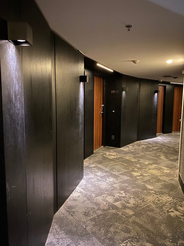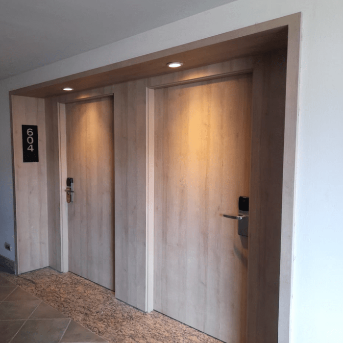 Em pouco tempo de inaugurado, a reclamação dos clientes proporcionou um retrofit das portas de entrada para porta acústica e resistente ao fogo 30 min, troca planejada e efetuada sem a paralização da operação do hotel.