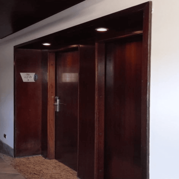 Tradicional hotel clássico fez retrofit das portas de entrada de apartamentos para portas acústicas e resistentes ao fogo 30min com design adequado ao estilo da construção e decoração.